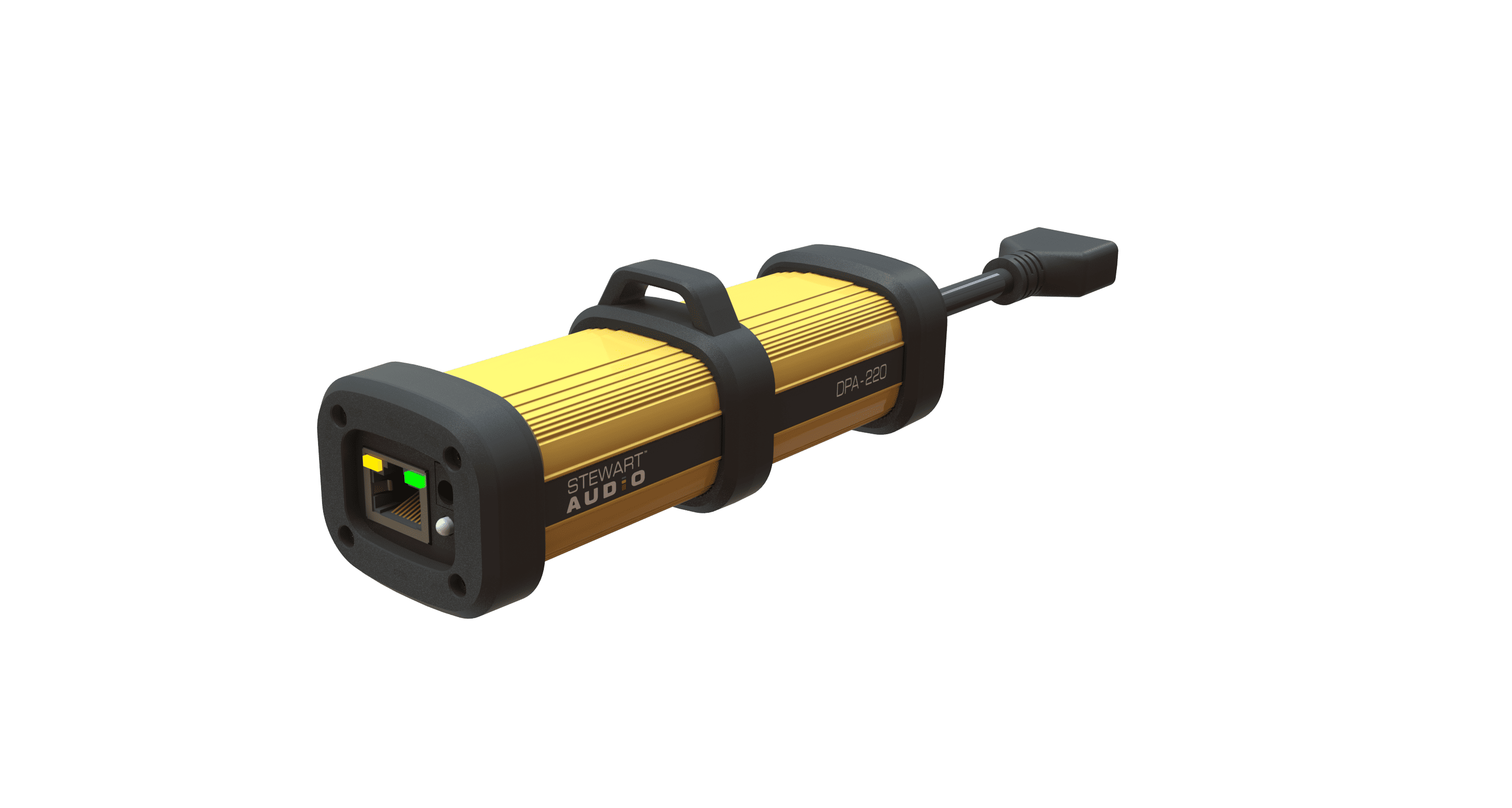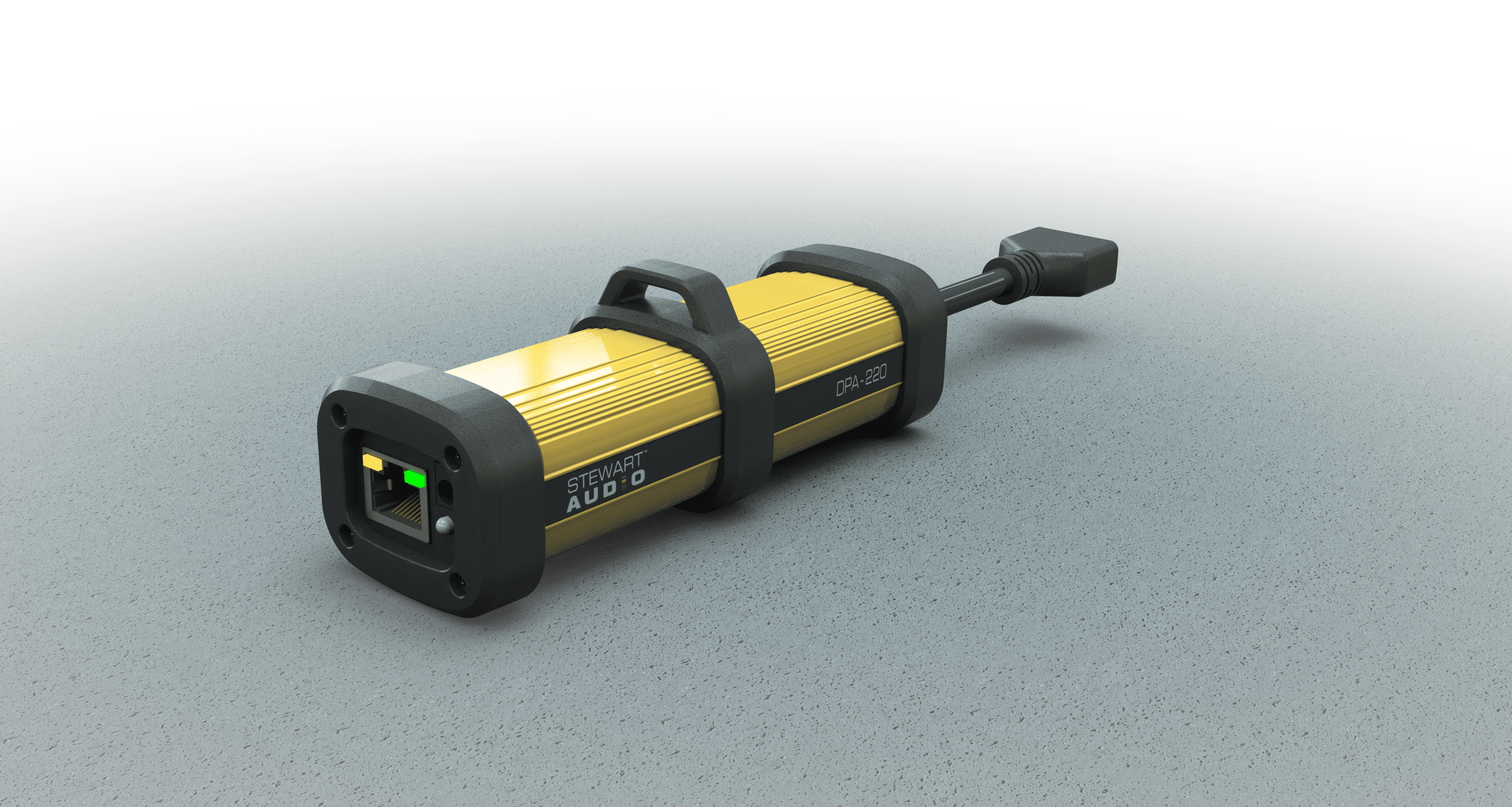 PowerCore™ DPA-220 Audio Amplifier with handle attached 45 degree-angle view